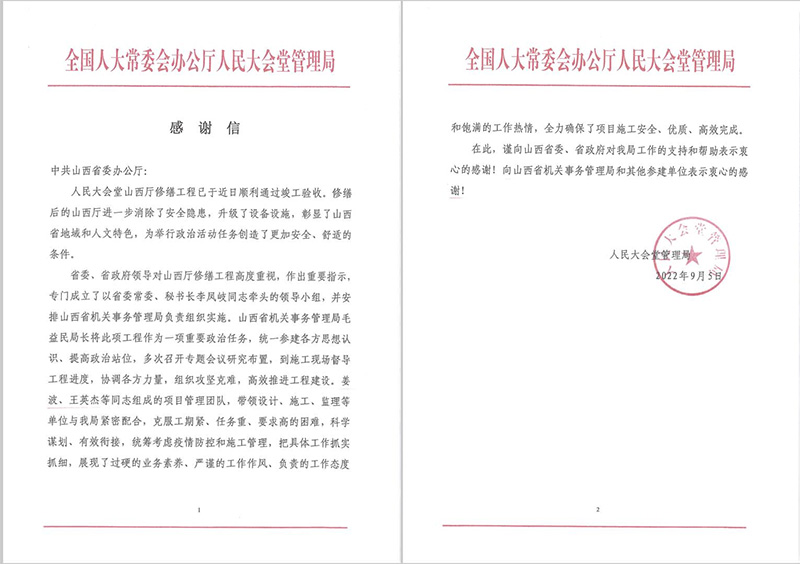 修繕后的山西廳進一步消除了安全隱患,升級了設備設施,彰顯了山西省地域和人文特色,為舉行政治活動任務創(chuàng)造了更加安全、舒適的條件。為此人民大會堂管理局特此向山西省機關事務管理局及其他參建單位表示衷心的感謝。