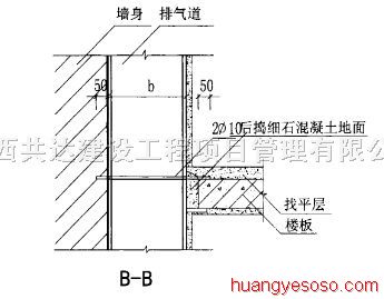 4、排氣煙道拼接過(guò)程中,在樓板預(yù)留洞口處使用2根圓10鋼筋進(jìn)行植筋處理,鋼筋間距同排氣煙道寬度。(見(jiàn)圖B-B)