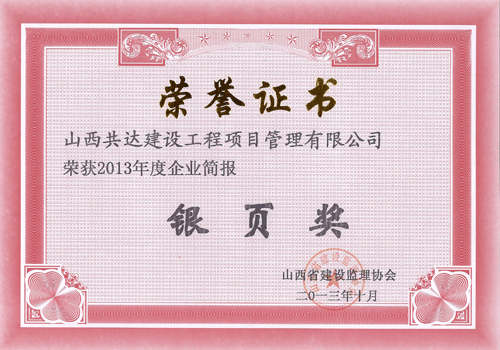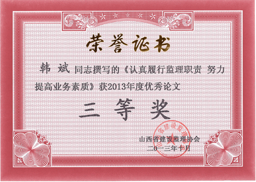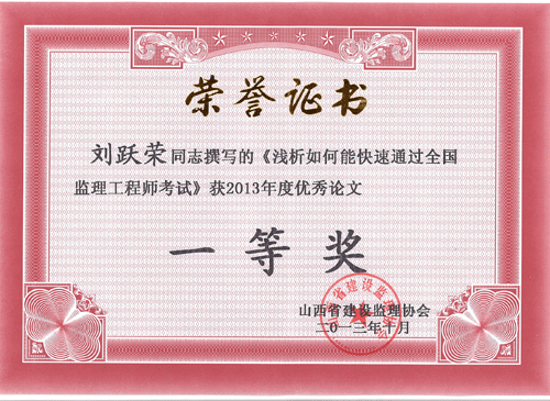 我公司分別榮獲了“2013年度企業(yè)簡報銀頁獎”、“2013年度監(jiān)理企業(yè)優(yōu)秀網站獎”,綜合辦公室金俊獲得了“2013年度優(yōu)秀通聯(lián)工作者”、工程監(jiān)理部劉躍榮撰寫的《淺析如何能快速通過全國監(jiān)理工程師考試》獲得了“2013年度優(yōu)秀論文一等獎”、監(jiān)理項目部韓賓撰寫的《認真履行監(jiān)理職責,努力提高業(yè)務素質》獲得了“2013年度優(yōu)秀論文三等獎”。