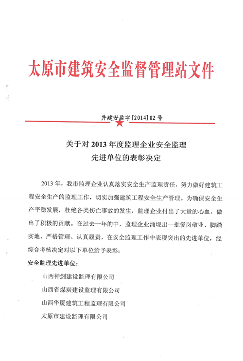 公司榮獲“2013年度安全監(jiān)理先進單位”