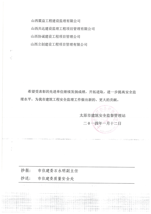 公司現(xiàn)為山西省建設監(jiān)理協(xié)會常務理事單位,《建設監(jiān)理》理事會理事單位,山西招標投標協(xié)會會員單位,山西省民防協(xié)會理事單位,太原市