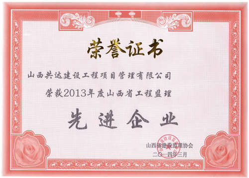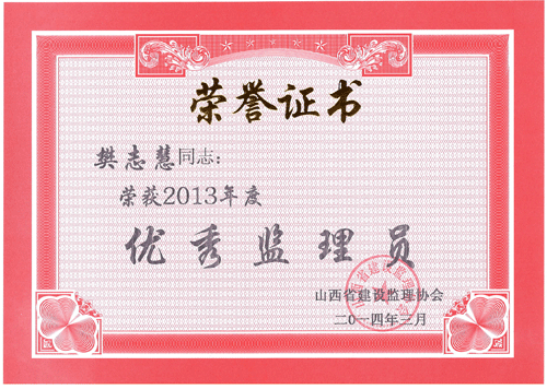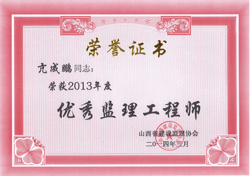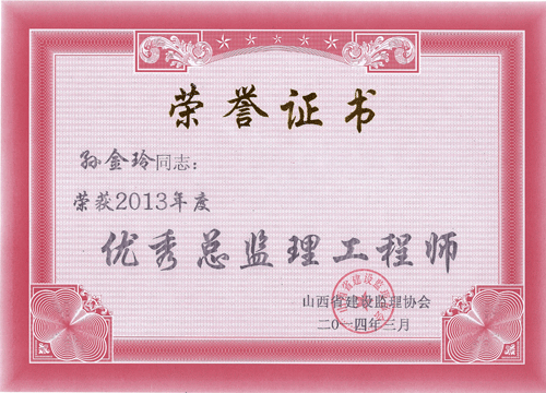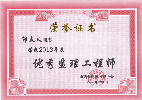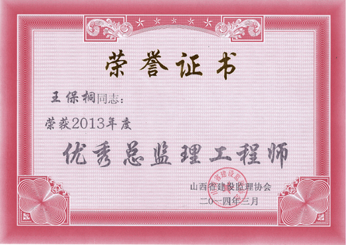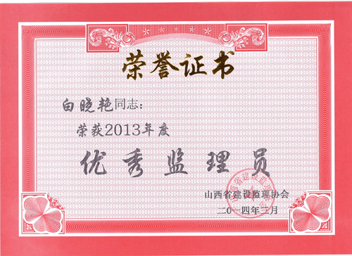 我公司被山西省建設(shè)監(jiān)理協(xié)會評為“2013年度工程監(jiān)理先進企業(yè)”,王保桐、孫金玲被評為“2013年度山西省優(yōu)秀總監(jiān)理工程師”,郭春義、亢成鵬被評為“2013年度山西省優(yōu)秀監(jiān)理工程師”,白曉艷、樊志慧被評為“2013年度山西省優(yōu)秀監(jiān)理員”。